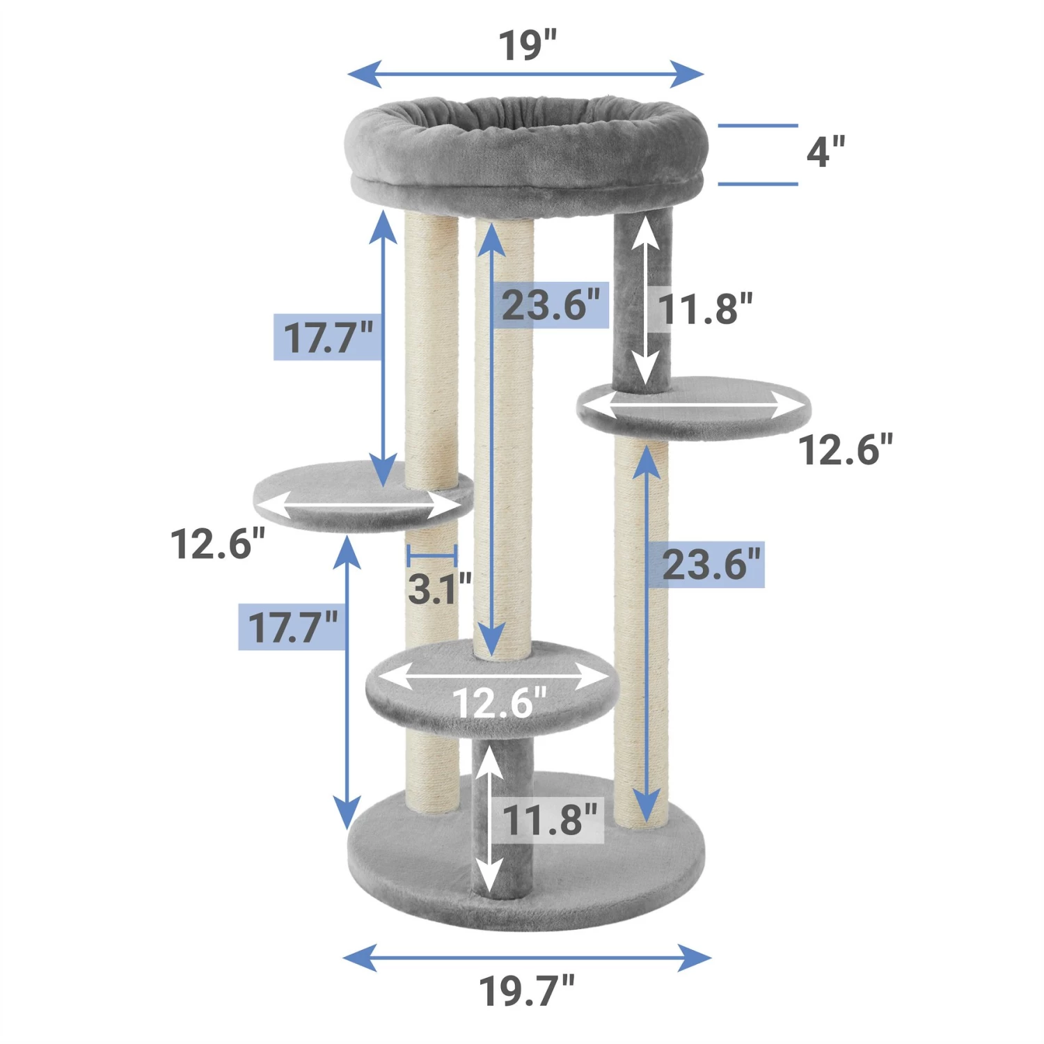 - Four tall, sisal-wrapped scratching posts for satisfying scratches and healthy nails.