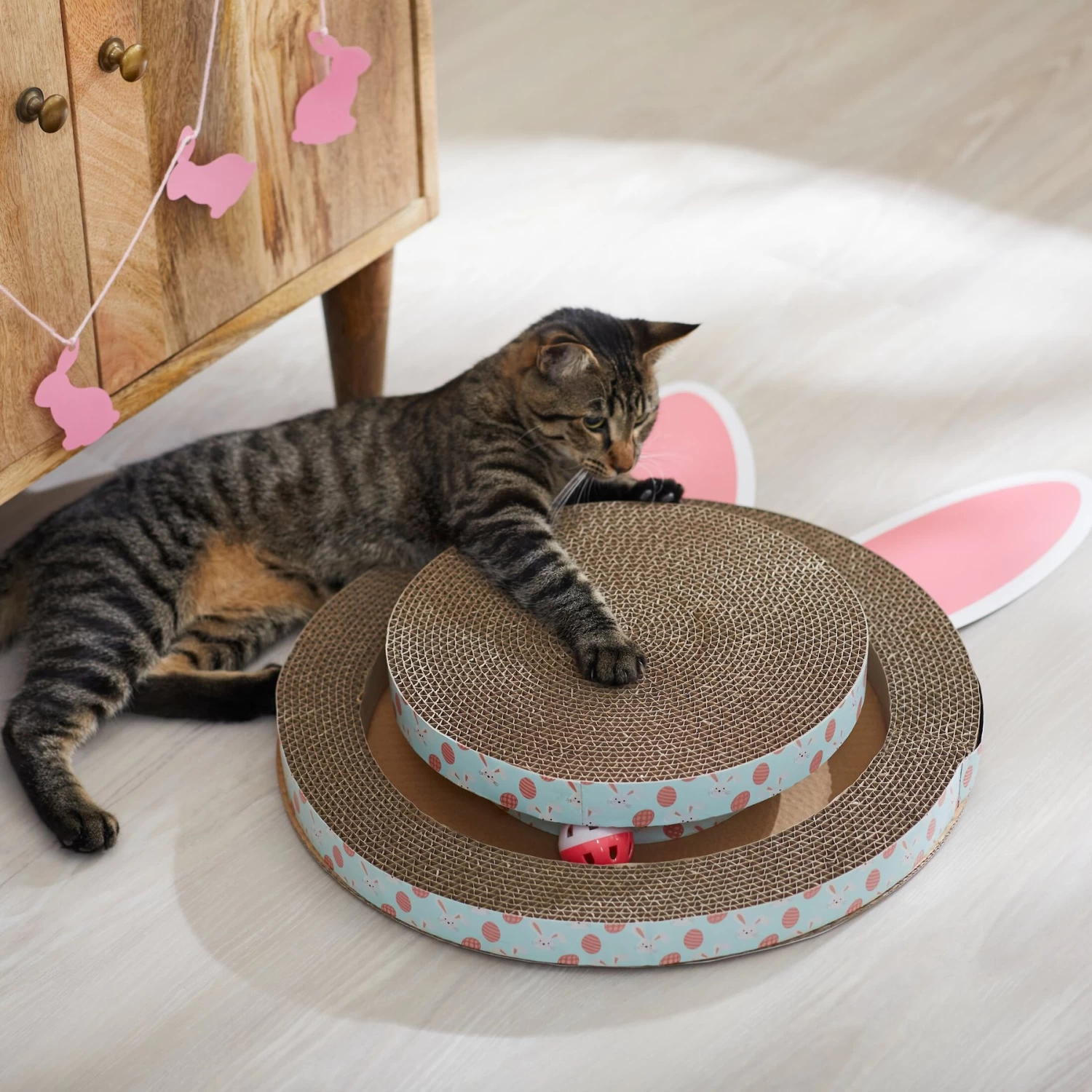 - This Easter-themed cat scratcher features a bunny design with big white rabbit ears.
