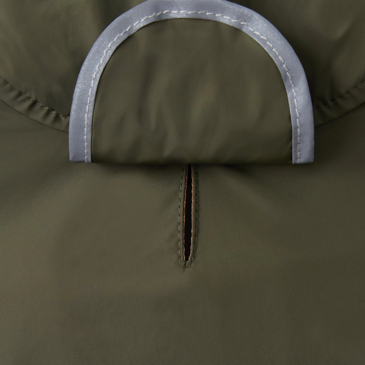 - Olive reversible raincoat is made from 100% polyester for a lightweight option that’s perfect for your pet on those rainy days.