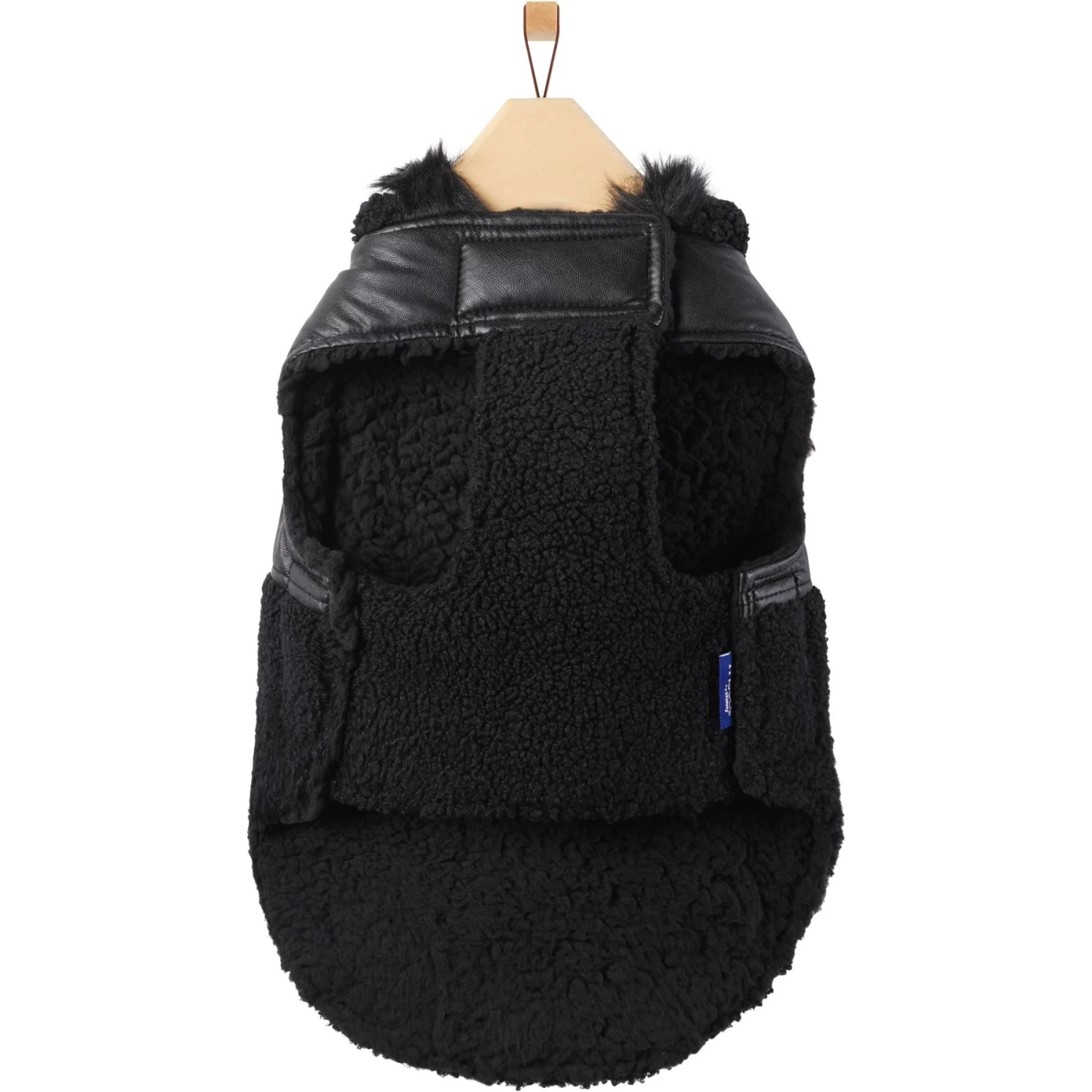 - Faux leather accents, two accent pockets, and a hood lined in faux fur give your pet a singular look of dashing style.